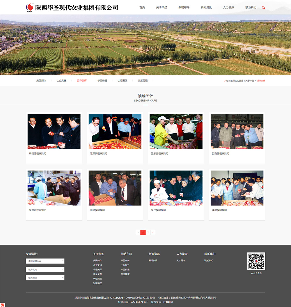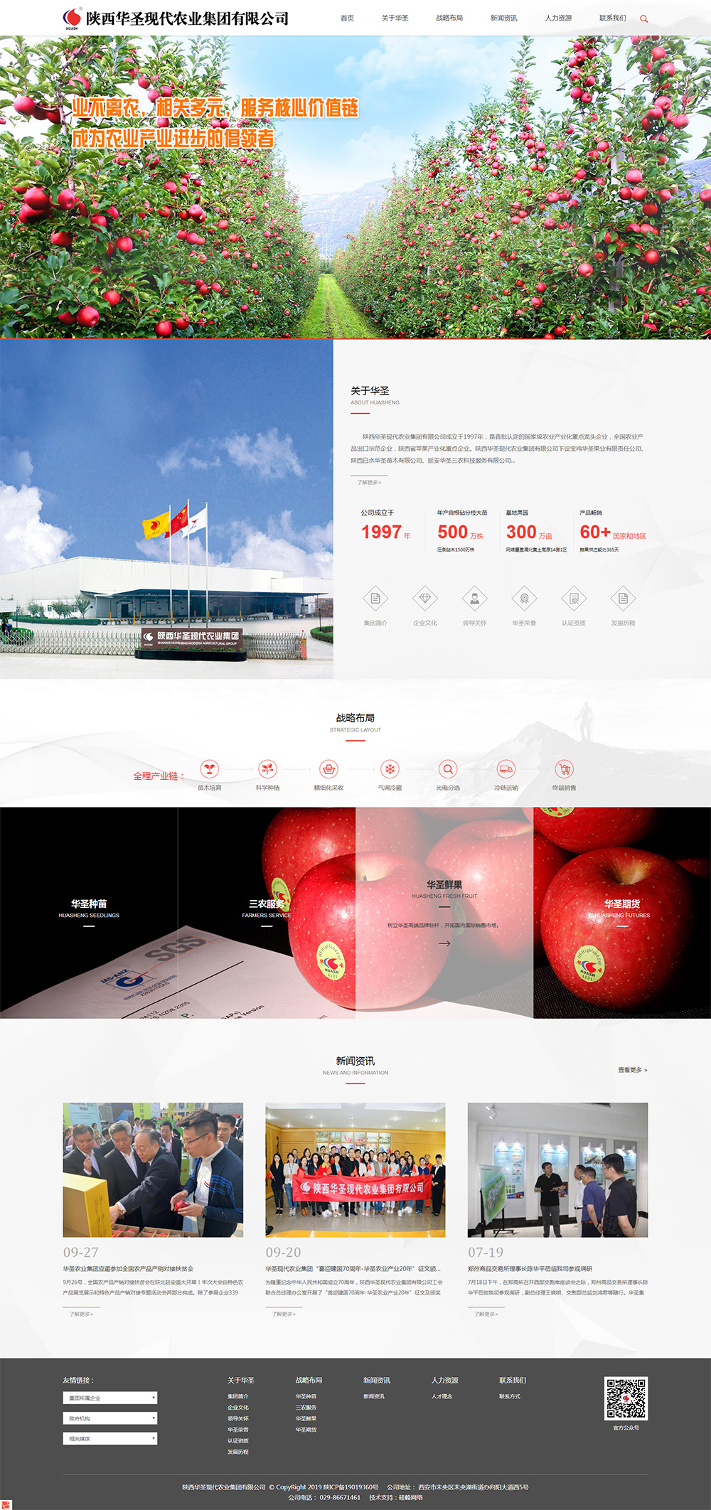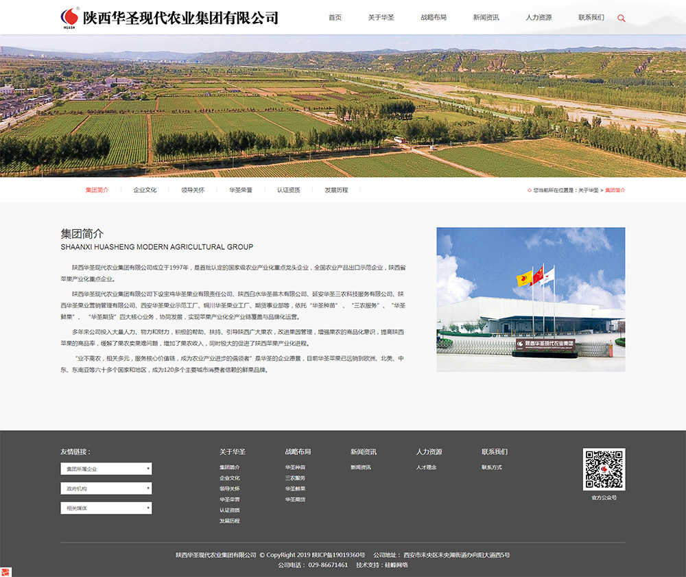 陜西華圣現代農業(yè)集團有限公司成立于1997年,是首批認定的國家級農業(yè)產(chǎn)業(yè)化重點(diǎn)龍頭企業(yè),全國農業(yè)產(chǎn)品出口示范企業(yè),陜西省蘋(píng)果產(chǎn)業(yè)化重點(diǎn)企業(yè)。陜西華圣現代農業(yè)集團有限公司下設寶雞華圣果業(yè)有限責任公司、陜西白水華圣苗木有限公司、延安華圣三農科技服務(wù)有限公司、陜西華圣果業(yè)營(yíng)銷(xiāo)管理有限公司、西安華圣果業(yè)示范工廠(chǎng)、銅川華圣果業(yè)工廠(chǎng)、期貨事業(yè)部等,依托“華圣種苗” 、“三農服務(wù)”、“華圣鮮果”、 “華圣期貨”四大核心業(yè)務(wù),協(xié)同發(fā)展,實(shí)現蘋(píng)果產(chǎn)業(yè)化全產(chǎn)業(yè)鏈覆蓋與品牌化運營(yíng)。