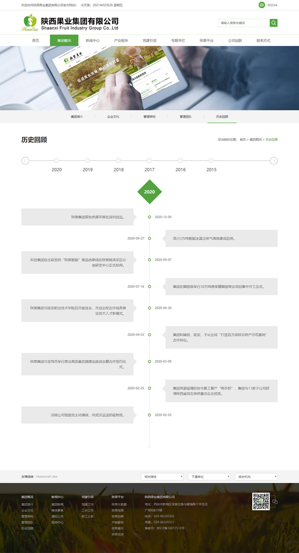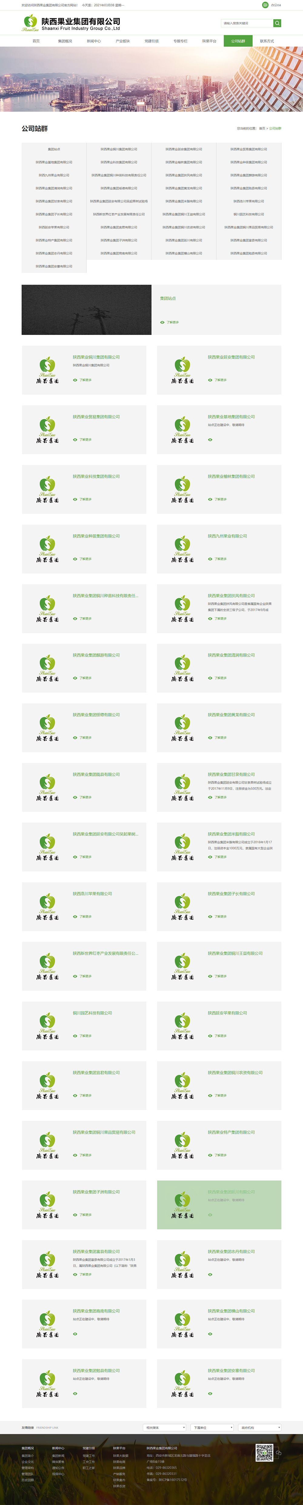 陜西果業(yè)集團是省政府組建的國有企業(yè),2015年10月掛牌成立,注冊資本金5億元。組建陜果集團是省政府按照現代工業(yè)、流通、金融、生態(tài)理念,“實(shí)施大企業(yè)集團引領(lǐng)戰略”,推動(dòng)我省果業(yè)轉型升級,實(shí)現由果業(yè)大省向果業(yè)強省轉變的一項重要舉措。