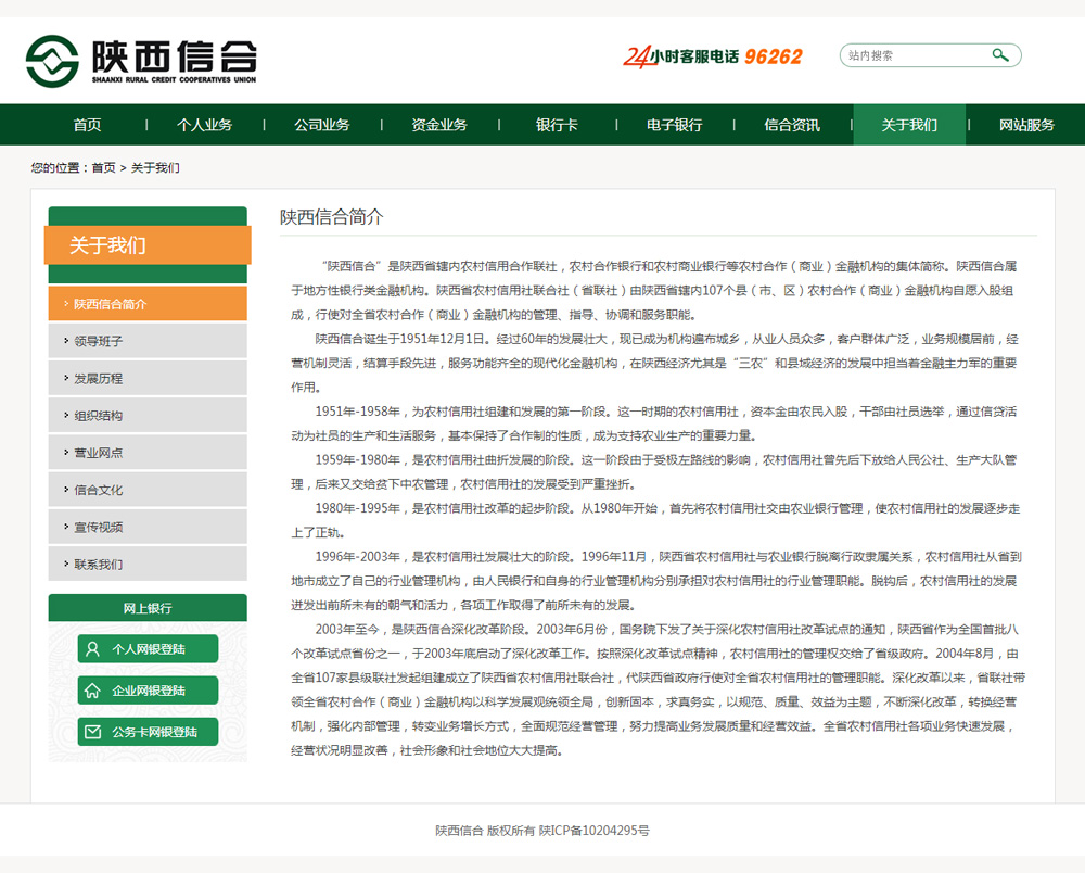 “陜西信合”是陜西省轄內農村信用合作聯(lián)社,農村合作銀行和農村商業(yè)銀行等農村合作(商業(yè))金融機構的集體簡(jiǎn)稱(chēng)。陜西信合屬于地方性銀行類(lèi)金融機構。 陜西信合誕生于1951年12月1日。經(jīng)過(guò)60年的發(fā)展壯大,現已成為機構遍布城鄉,從業(yè)人員眾多,客戶(hù)群體廣泛,業(yè)務(wù)規模居前,經(jīng)營(yíng)機制靈活,結算手段先進(jìn),服務(wù)功能齊全的現代化金融機構。