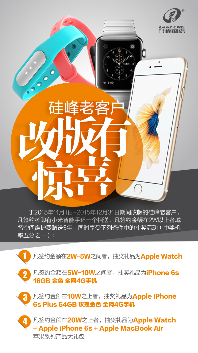 于2015年11月1日-2015年12月31日期間改版的硅峰老客戶(hù),凡簽約者即有【小米智能手環(huán)】一個(gè)相送,凡簽約金額在2W以上者域名空間維護費贈送3年,同時(shí)享受下列條件中的抽獎活動(dòng)(中獎機率五分之一):