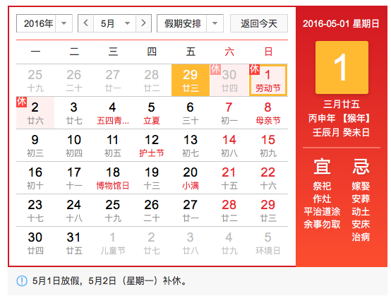 2016年五一勞動(dòng)節放假時(shí)間為4月30日(周六)至5月2日(周一),共3天。