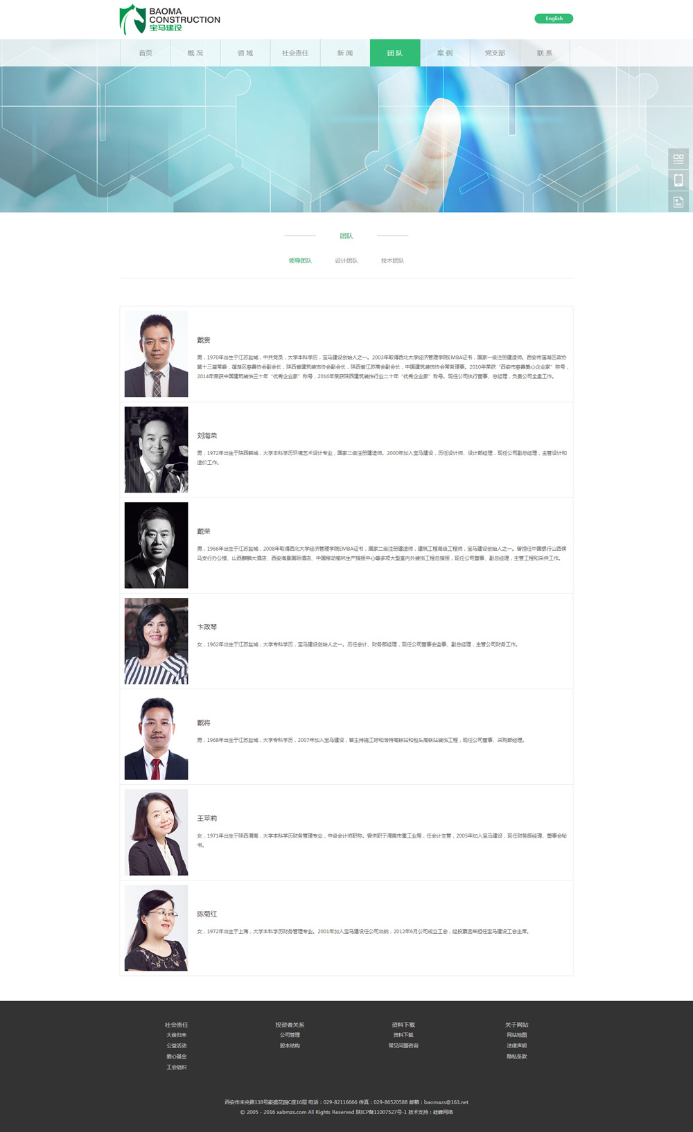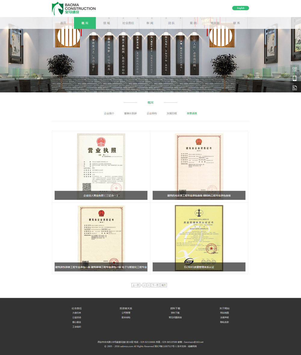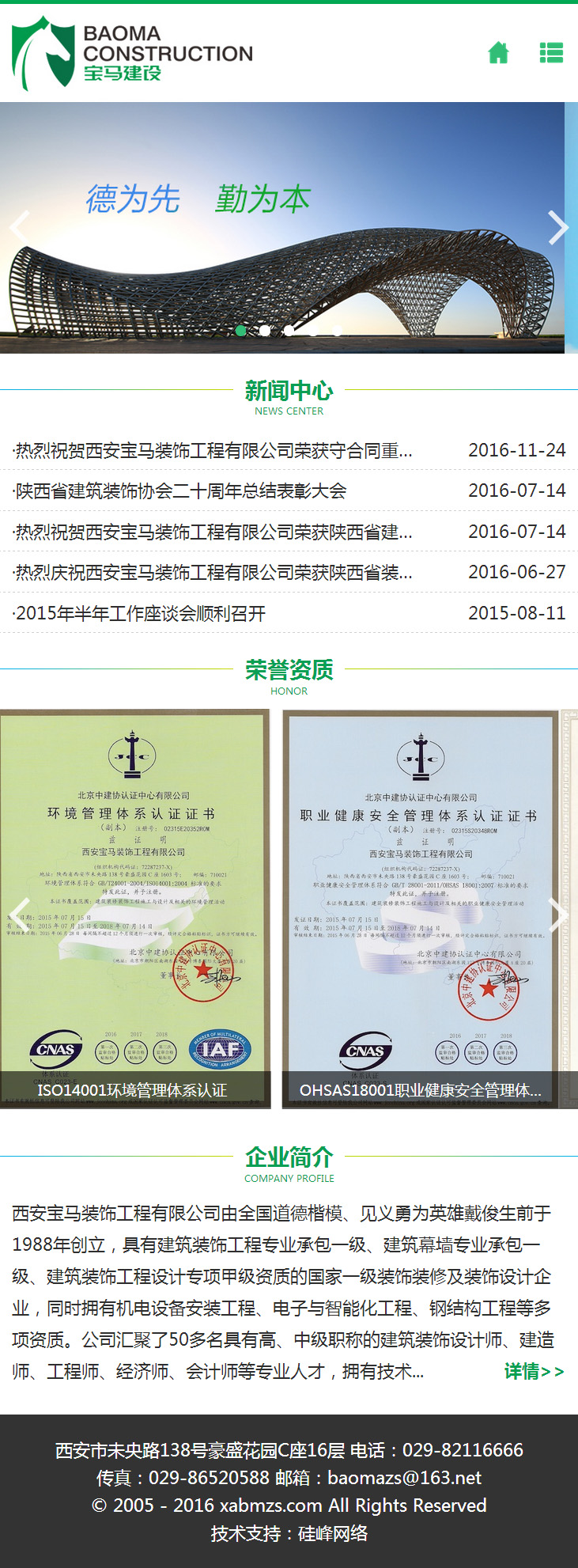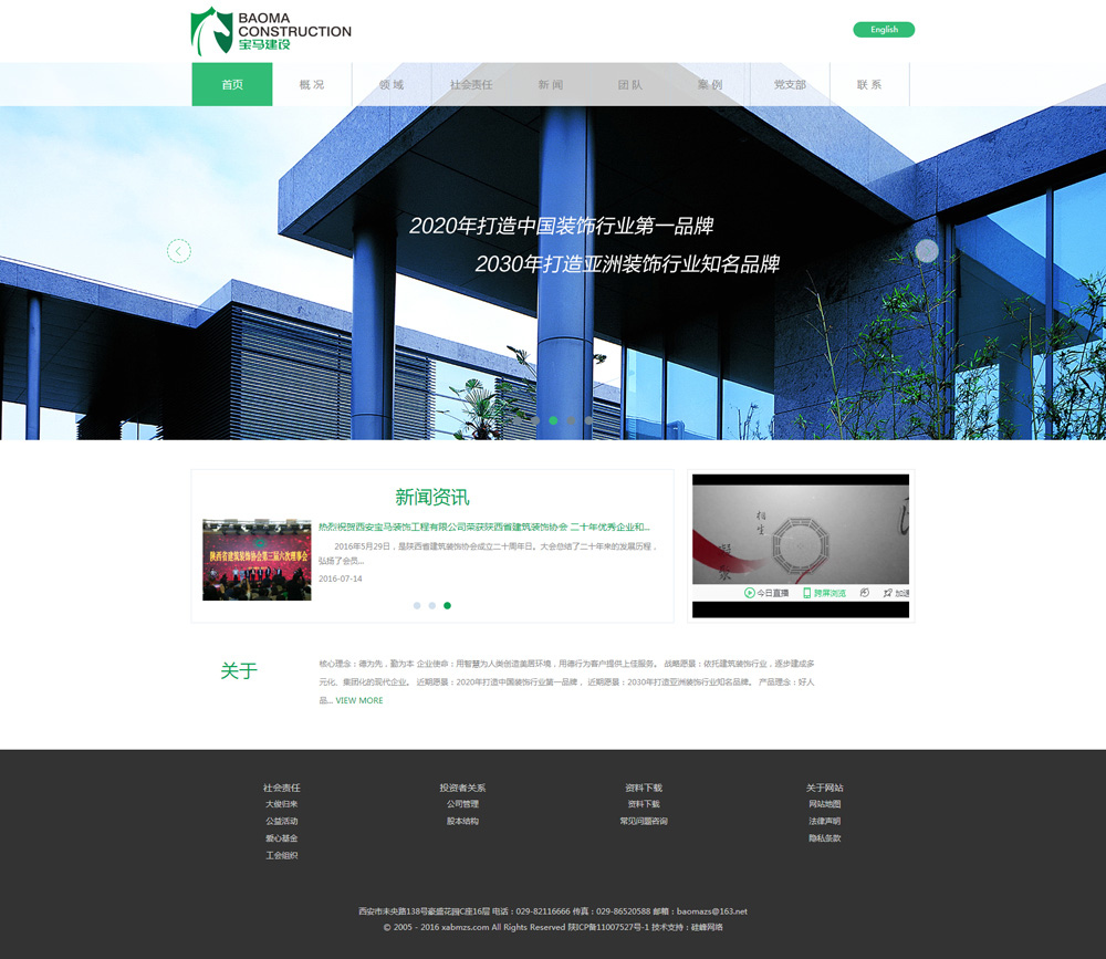 西安寶馬裝飾工程有限公司由全國道德楷模、見(jiàn)義勇為英雄戴俊生前于1988年創(chuàng )立,具有建筑裝飾工程專(zhuān)業(yè)承包一級、建筑幕墻專(zhuān)業(yè)承包一級、建筑裝飾工程設計專(zhuān)項甲級資質(zhì)的國家一級裝飾裝修及裝飾設計企業(yè),同時(shí)擁有機電設備安裝工程、電子與智能化工程、鋼結構工程等多項資質(zhì)。公司匯聚了50多名具有高、中級職稱(chēng)的建筑裝飾設計師、建造師、工程師、經(jīng)濟師、會(huì )計師等專(zhuān)業(yè)人才,擁有技術(shù)等級五級以上的施工骨干達200多人,均來(lái)自于江蘇、浙江、廣東、福建一帶技術(shù)工匠。