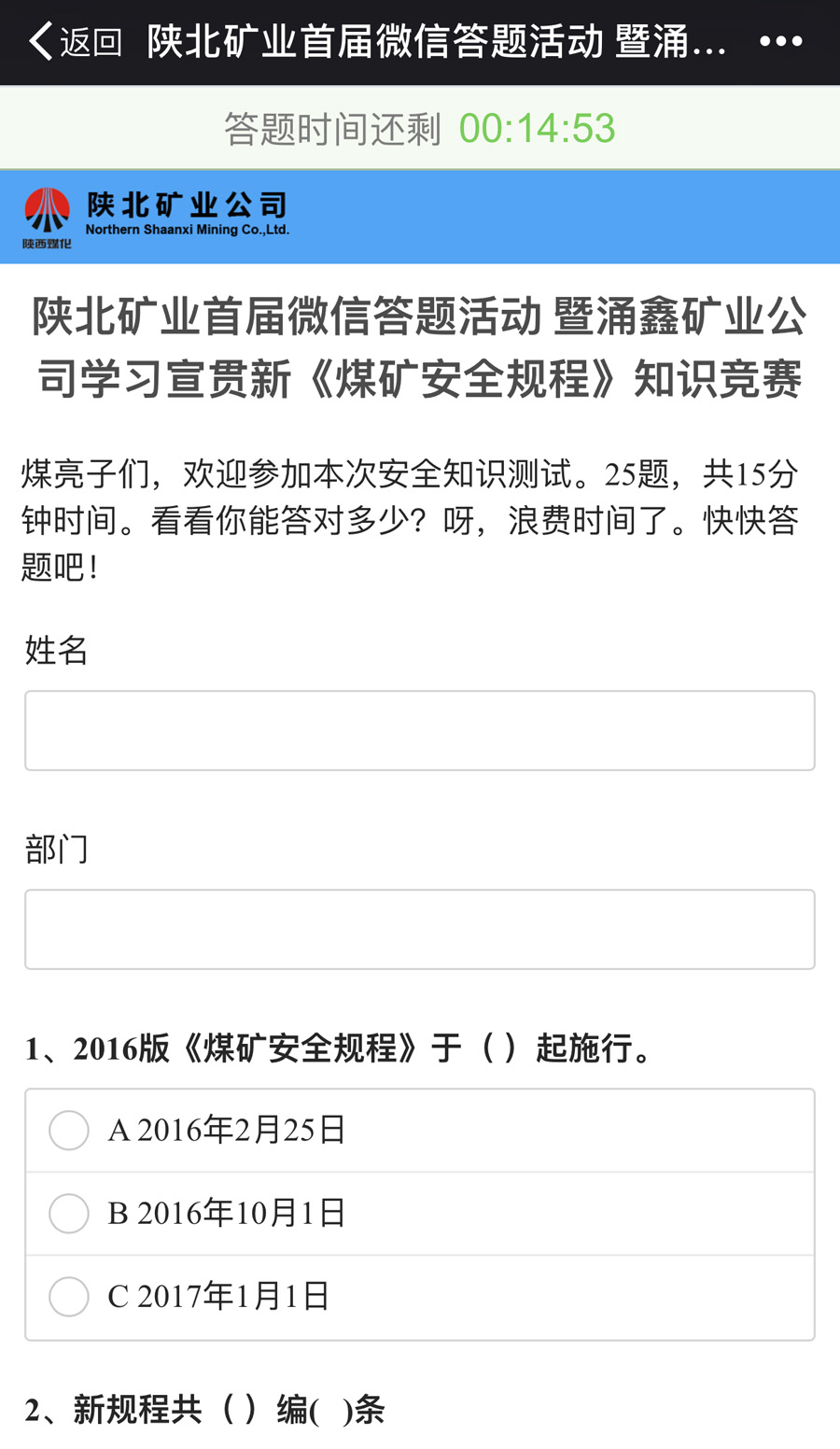 陜北礦業(yè)公司是陜煤化集團的全資子公司,是集煤、油、氣、電一體化循環(huán)經(jīng)濟的國有大型能源化工企業(yè)。公司前身為蘭州軍區后勤部的部隊企業(yè),成立于1988年,2005年7月改制為陜北礦業(yè)公司。公司總部位于榆林市高新區,下屬韓家灣煤炭公司、涌鑫礦業(yè)公司、生產(chǎn)服務(wù)分公司和乾元能化公司四個(gè)企業(yè)。
