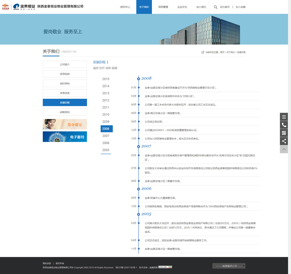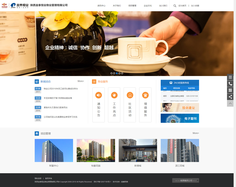 金泰恒業(yè)物業(yè)公司于2009年第一次選擇硅峰網(wǎng)絡(luò )初次建站,6年來(lái)一直保持著(zhù)良好的合作關(guān)系,2016年這次改版后的網(wǎng)站更能體現公司文化及品牌形象,更能為業(yè)主提供有效的信息和物業(yè)服務(wù)。