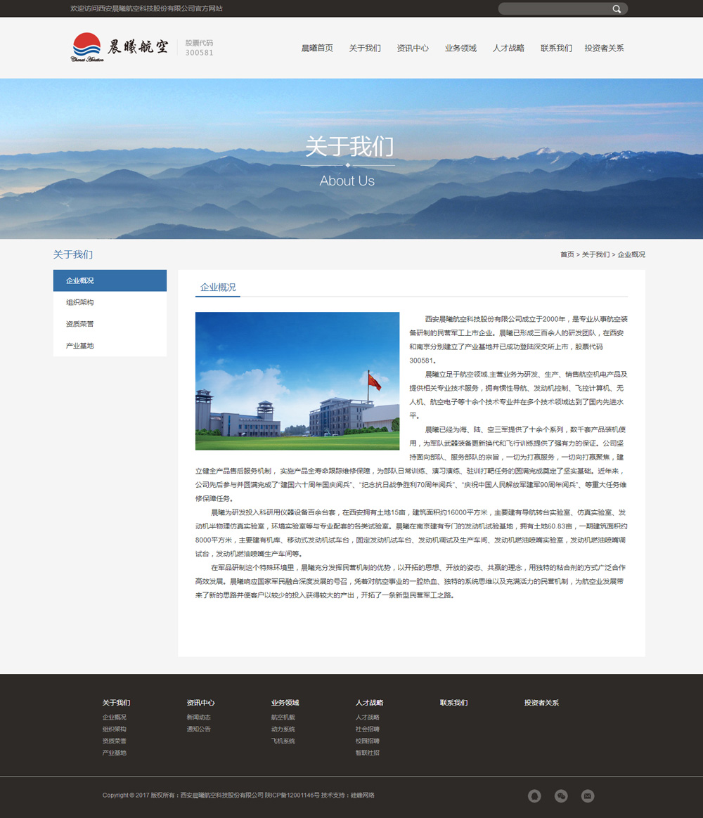 西安晨曦航空科技股份有限公司成立于2000年,是專(zhuān)業(yè)從事航空裝備研制的民營(yíng)軍工上市企業(yè)。晨曦已形成三百余人的研發(fā)團隊,在西安和南京分別建立了產(chǎn)業(yè)基地并已成功登陸深交所上市,股票代碼300581。